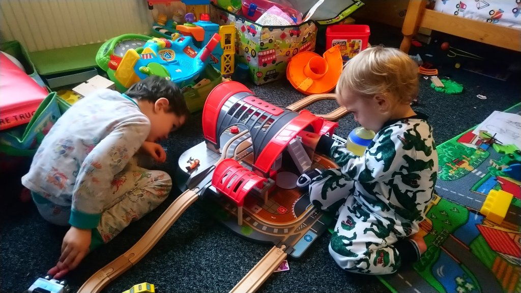 Nope, we spent the day (mostly on the floor) playing. Ben built a wooden rescue centre tower while I was attacked by a Robotic Dinosaur. We all played Greedy Granny and Shark Bite. There were lots of fires that needed putting out, and sirens wailing. And every so often the Train Set made an announcement detailing which train was arriving. Skye surveyed the scene from her Ultimate Rescue Helicopter
