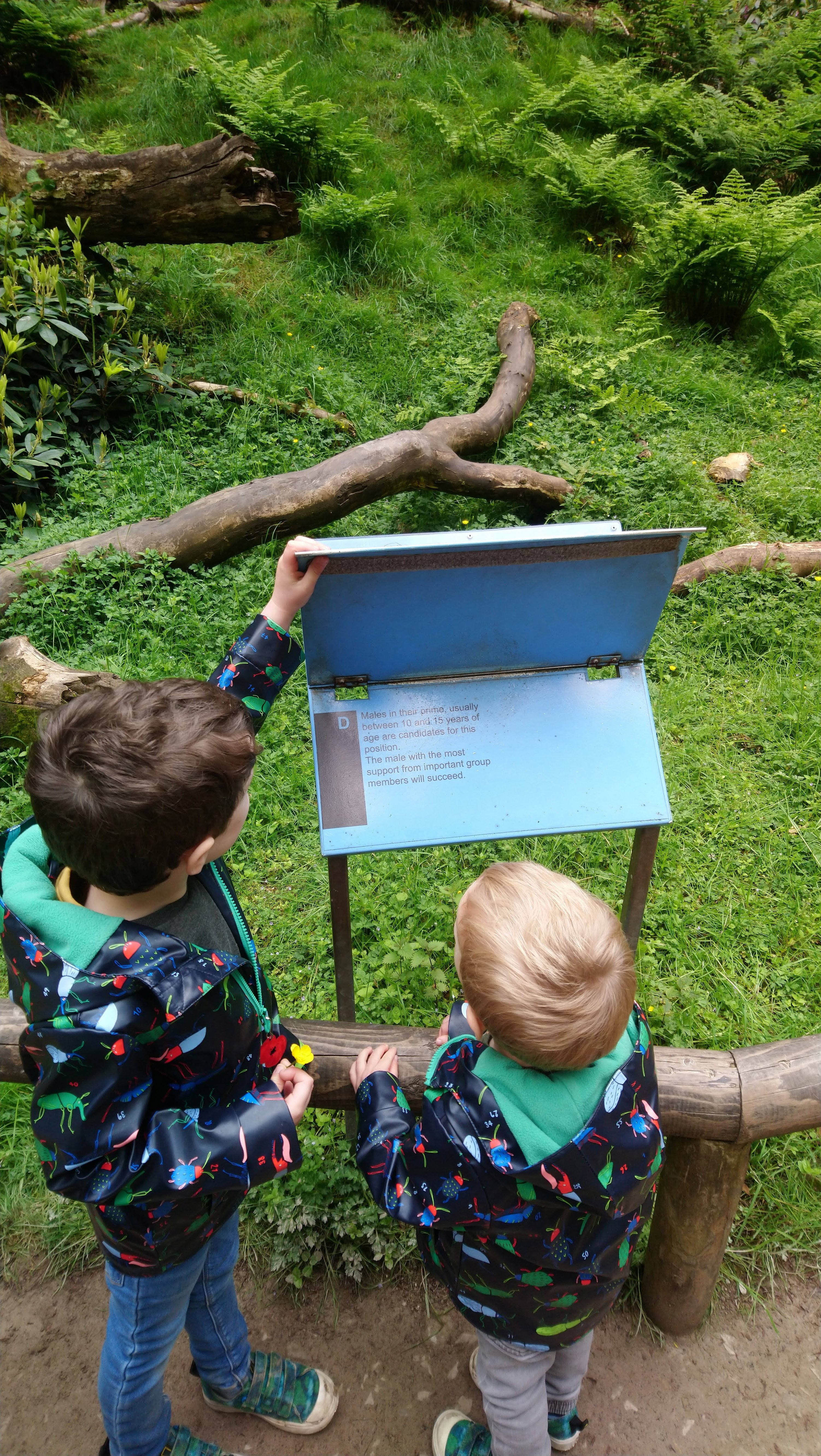 Once past the second feeding station, we followed the path down into the bottom half of the enclosure where a stream runs alongside the route. Along the path are several interactive information boards explaining monkey behaviour, facial expressions and hierarchy.