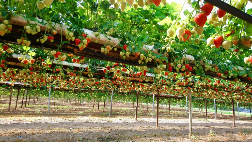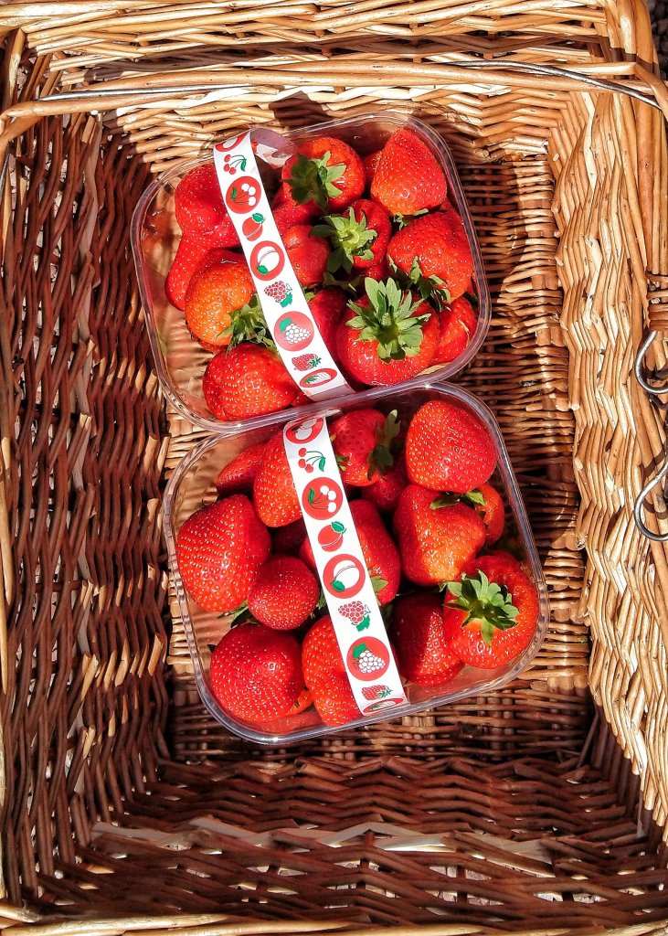 There’s a sizeable carpark on site and the PYO area is accessed through the well stocked farm shop. There is a range of fruit available to harvest but we were set on strawberries. Now here’s the great part…all the strawberries are planted in raised troughs within huge polytunnels so there is no bending, you are protected from the elements (British summer time can NOT be trusted) and children can pick the juicy ripe fruit easily. There is also plenty of space between the ‘aisles’ of plants so it was buggy friendly too.